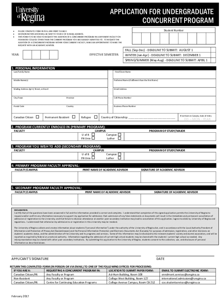 APPLICATION FOR UNDERGRADUATE CONCURRENT PROGRAM Student Numberless COMPLETE FORM IN FULL AND PRINT CLEARLY. DECISION NOTIFICATION WILL BE SENT TO YOUR U OF R EMAIL ADDRESS. THIS FORM IS TO BE USED