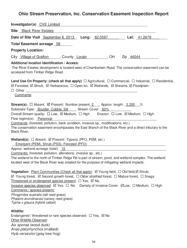 Ohio Stream Preservation, Inc. Conservation Easement Inspection Report Investigator(s) _CVE Limited___ Site _ Black River Estates___ Date of Site Visit _September 6, 2013 _ Long: _82.0597___ Lat: