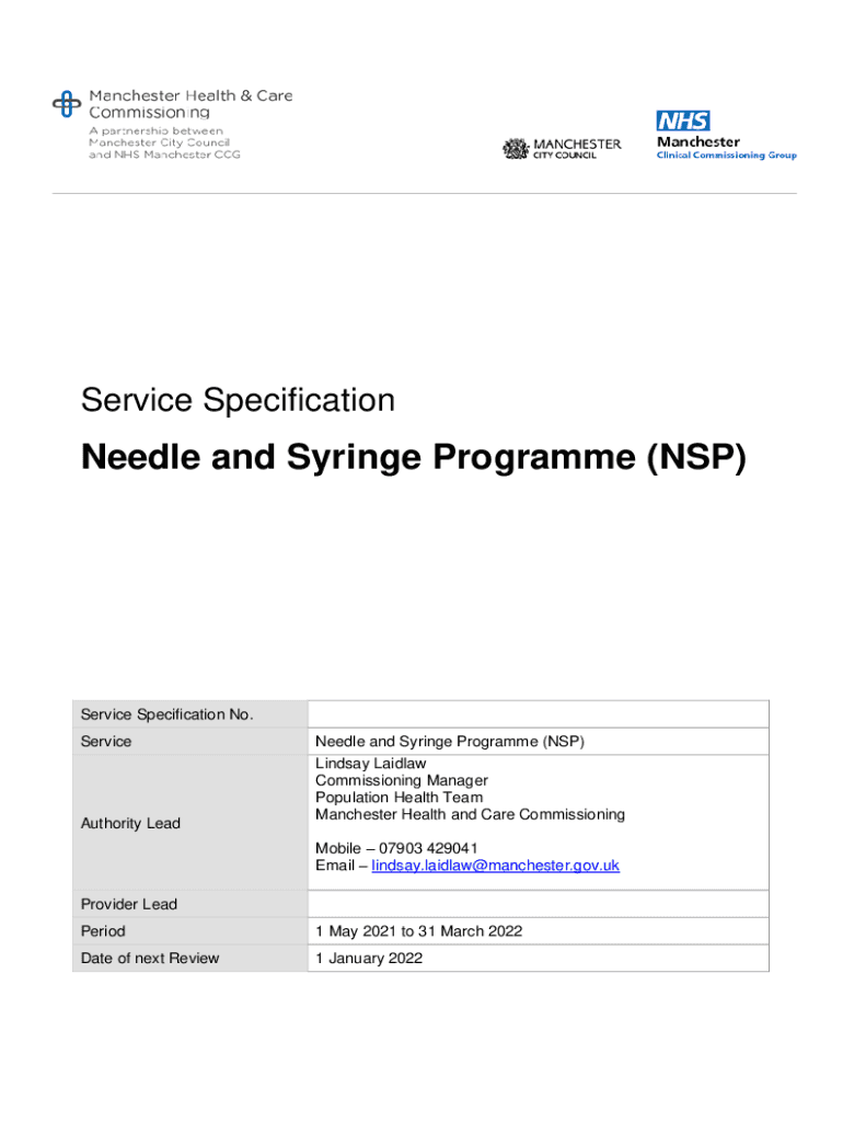 Service SpecificationNeedle and Syringe Program (NSW)Service Specification No. ServiceAuthority Learnedly and Syringe Program (NSW) Lindsay Laid law Commissioning Manager Population Health Team Manchester