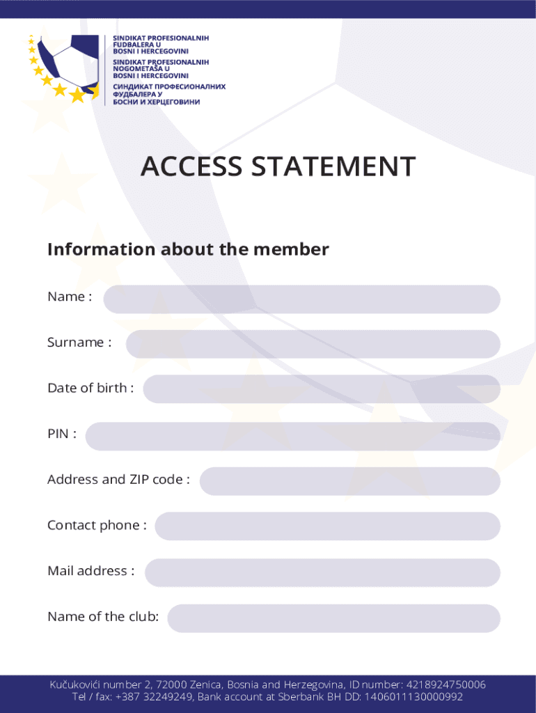 ACCESS STATEMENT Information about the member Name : Surname : Date of birth : PIN : Address and ZIP code : Contact phone : Mail address : Name of the club:Kuukovii number 2, 72000 Monica, Bosnia