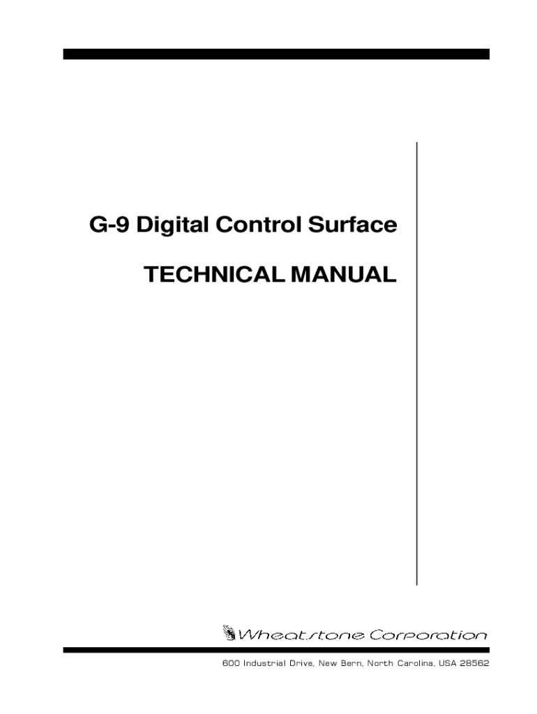 G9 Digital Control Surface TECHNICAL MANUAL600 Industrial Drive, New Bern, North Carolina, USA 28562G9 Digital Control Surface Technical Manual 1st Edition 2003 Wheatstone CorporationWHEATSTONE CORPORATION