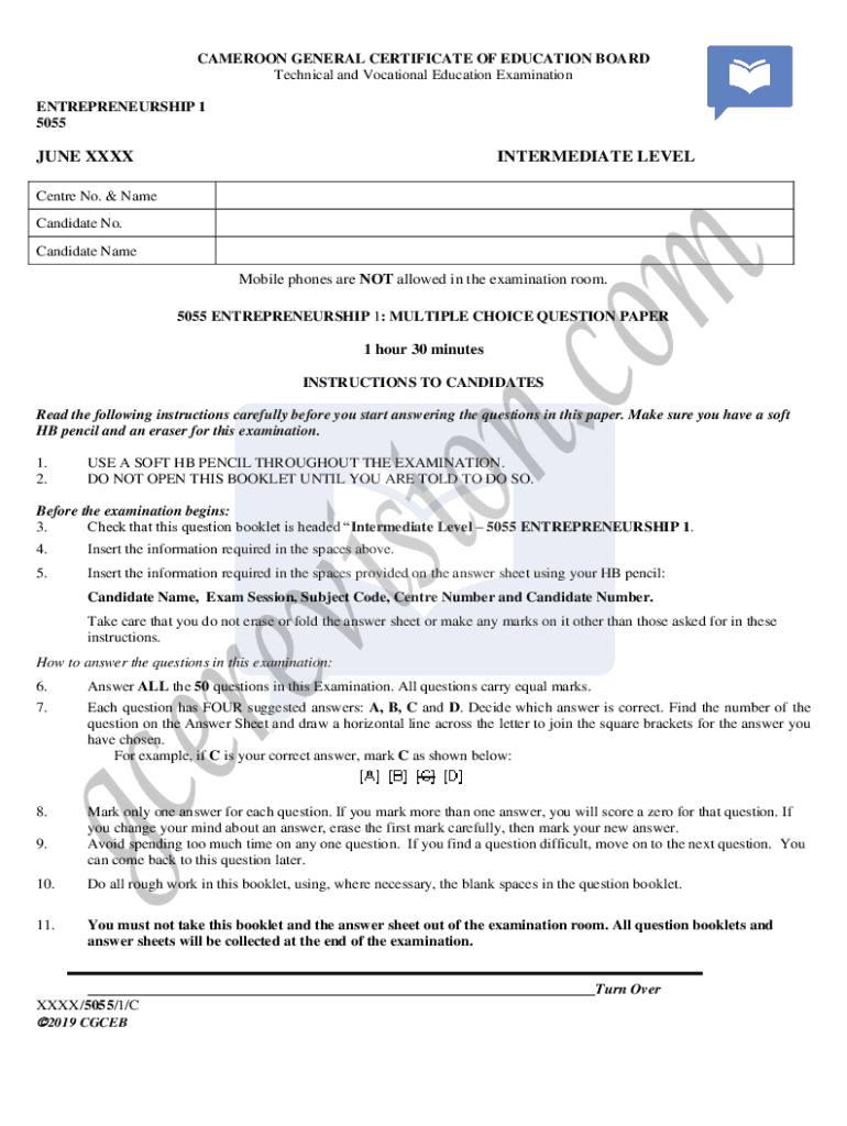 CAMEROON GENERAL CERTIFICATE OF EDUCATION BOARD Technical and Vocational Education Examination ENTREPRENEURSHIP 1 5055JUNE XXXXINTERMEDIATE LEVELCentre No. & Name Candidate No. Candidate Name Mobile