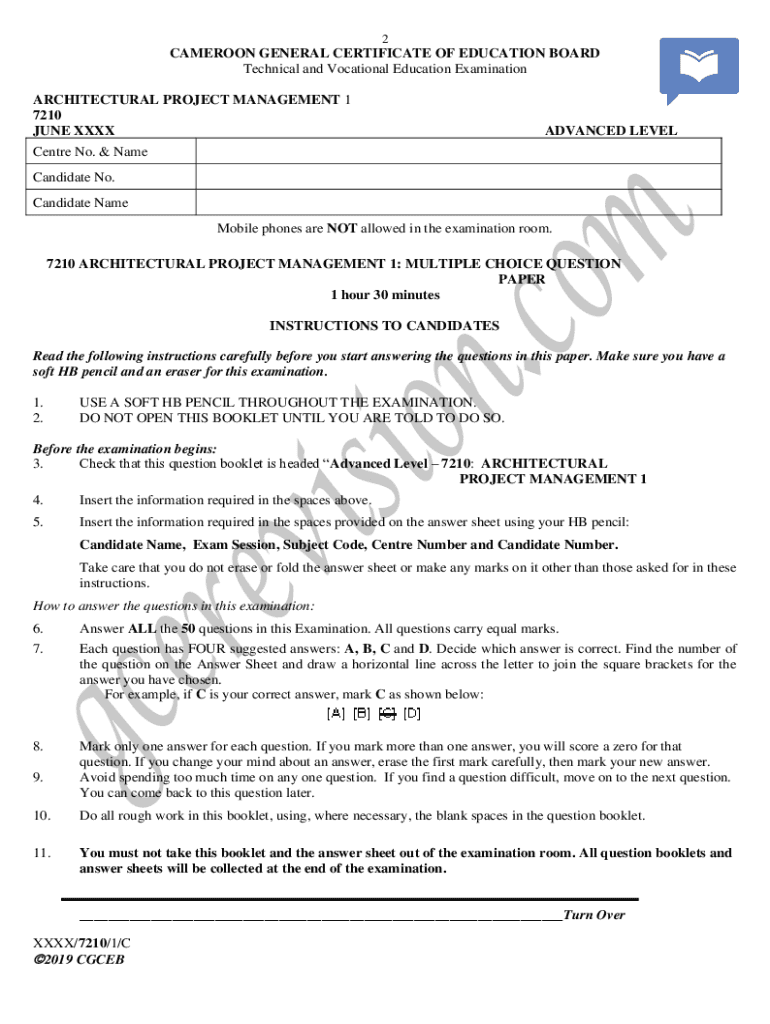2CAMEROON GENERAL CERTIFICATE OF EDUCATION BOARD Technical and Vocational Education Examination ARCHITECTURAL PROJECT MANAGEMENT 1 7210 JUNE XXXXADVANCED LEVELCentre No. & Name Candidate No. Candidate