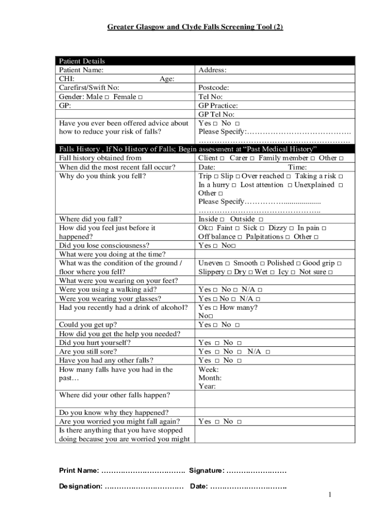 Greater Glasgow and Clyde Falls Screening Tool (2)Patient Details Patient Name: CHI: Care first/Swift No: Gender: Male Female GP:Address: Age:Postcode: Tel No: GP Practice: GP Tel No: Have you ever