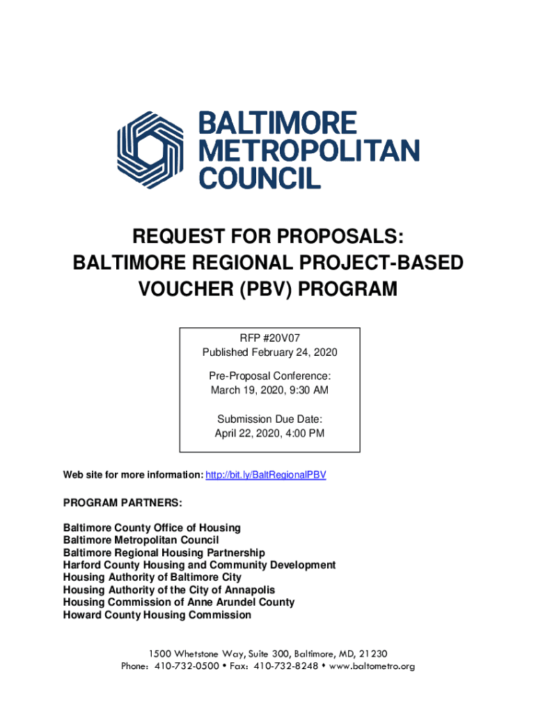 REQUEST FOR PROPOSALS: BALTIMORE REGIONAL PROJECTED VOUCHER (PBA) PROGRAM RFP #20V07 Published February 24, 2020, Proposal Conference: March 19, 2020, 9:30 AM Submission Due Date: April 22, 2020,
