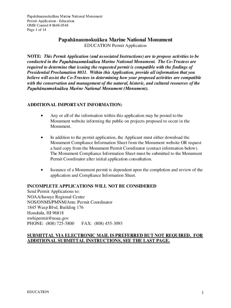 Papahnaumokukea Marine National Monument Permit Application Education OMB Control # 06480548-Page 1 of 14Papahnaumokukea Marine National Monument EDUCATION Permit Application NOTE: This Permit Application