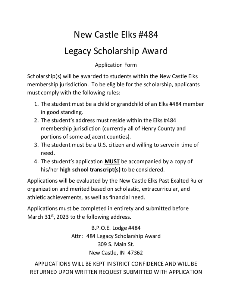 New Castle Elks #484 Legacy Scholarship Award Application Form Scholarship(s) will be awarded to students within the New Castle Elks membership jurisdiction. To be eligible for the scholarship, applicants