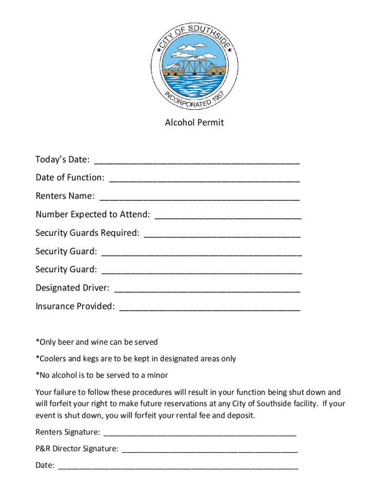 Alcohol Permit Today's Date: ___ Date of Function: ___ Renters Name: ___ Number Expected to Attend: ___ Security Guards Required: ___ Security Guard: ___ Security Guard: ___ Designated Driver: ___