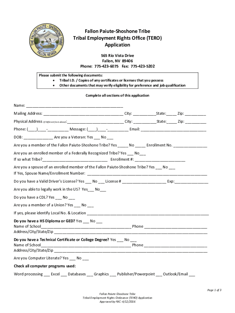 Fallon Paiute Shoshone Tribe Tribal Employment Rights Office (TERM) Application 565 Rio Vista Drive Fallon, NV 89406 Phone: 7754236075 Fax: 7754235202 Please submit the following documents: Tribal
