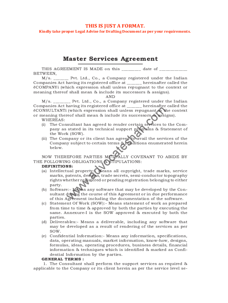 2206THIS IS JUST A FORMAT. Kindly take proper Legal Advice for Drafting Document as per your requirements. Form No. 15 Master Services Agreement w.a DV OC at BS ha h. com THIS AGREEMENT IS MADE on