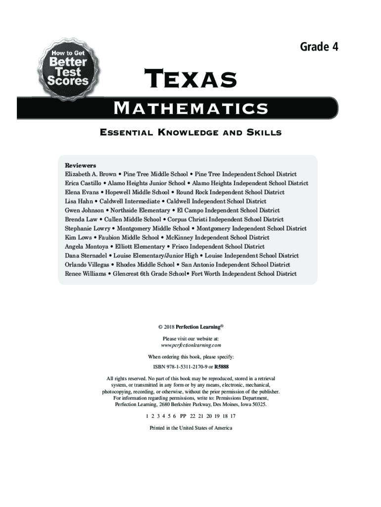 Grade 4TEXASMathematics ESSENTIAL KNOWLEDGEANDSKILLSReviewers Elizabeth A. Brown Pine Tree Middle School Pine Tree Independent School District Erica Castillo Alamo Heights Junior School Alamo Heights