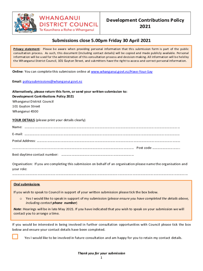 Development Contributions Policy 2021 Submissions close 5.00pm Friday 30 April 2021 Privacy statement: Please be aware when providing personal information that this submission form is part of the