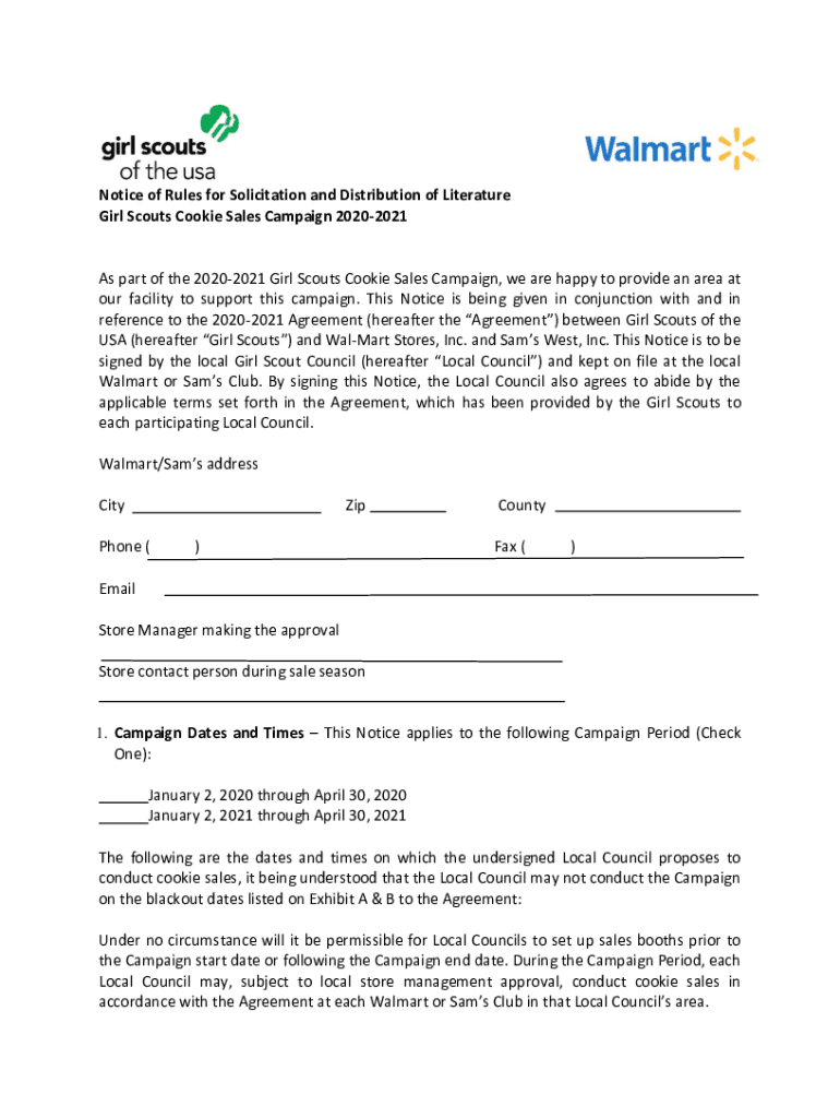 Notice of Rules for Solicitation and Distribution of Literature Girl Scouts Cookie Sales Campaign 20202021As part of the 20202021 Girl Scouts Cookie Sales Campaign, we are happy to provide an area