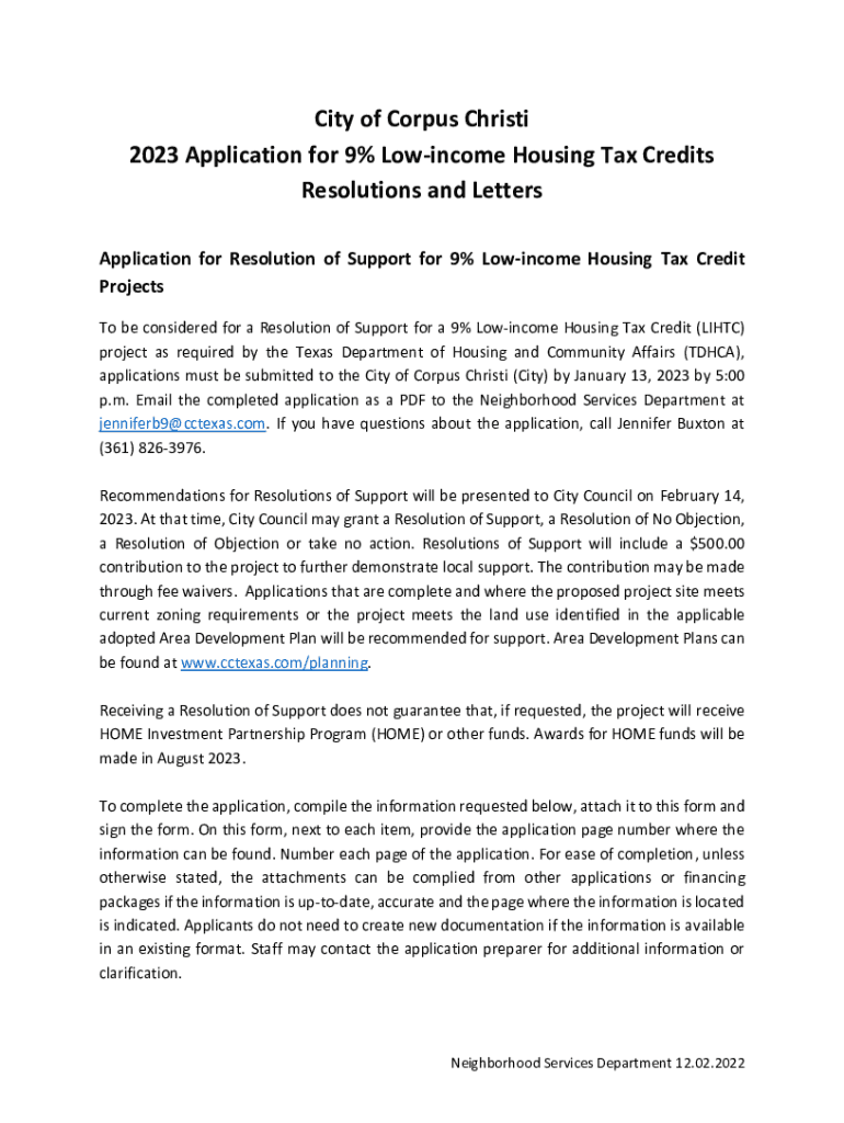 City of Corpus Christi 2023 Application for 9% Low income Housing Tax Credits Resolutions and Letters Application for Resolution of Support for 9% Low income Housing Tax Credit Projects To be considered