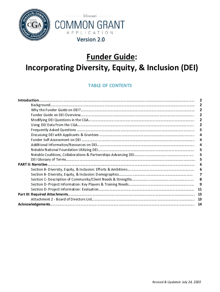 Funder Guide: Incorporating Diversity, Equity, & Inclusion (DEI) TABLE OF CONTENTS Introduction Background Why the Funder Guide on DEI?
