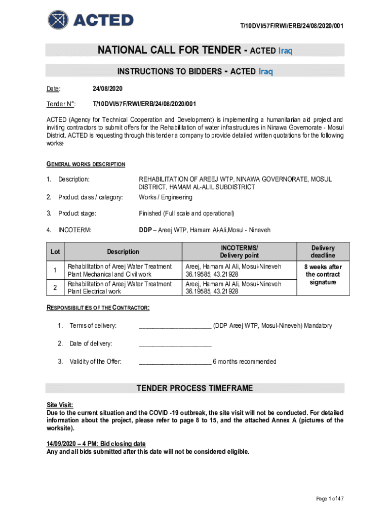 T/10DVI/57F/WWI/ERA/24/08/2020/001NATIONAL CALL FOR TENDER ACTED Iraq INSTRUCTIONS TO BIDDERS ACTED Iraq Date:24/08/2020Tender N:T/10DVI/57F/WWI/ERA/24/08/2020/001ACTED (Agency for Technical Cooperation