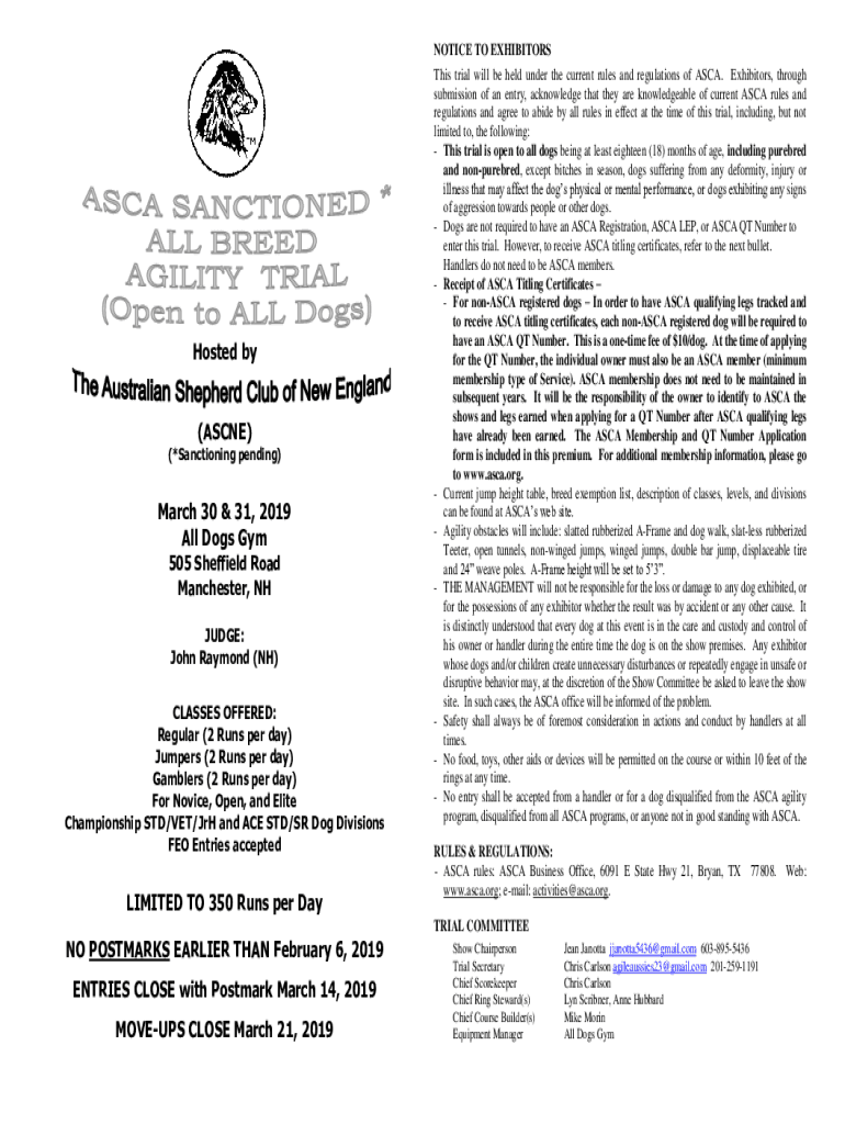 Hosted by (ACNE) (*Sanctioning pending)March 30 & 31, 2019 All Dogs Gym 505 Sheffield Road Manchester, NH JUDGE: John Raymond (NH) CLASSES OFFERED: Regular (2 Runs per day) Jumpers (2 Runs per day)