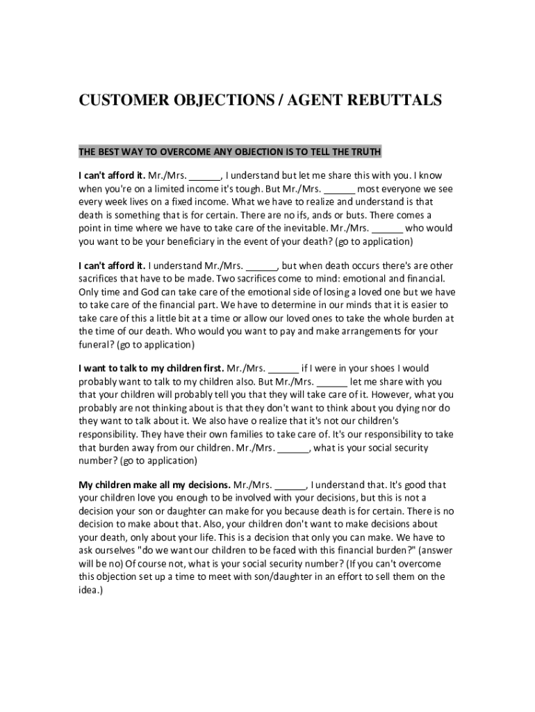 CUSTOMER OBJECTIONS / AGENT REBUTTALS THE BEST WAY TO OVERCOME ANY OBJECTION IS TO TELL THE TRUTH I can\'t afford it. Mr./Mrs. ___, I understand but let me share this with you. I know when you\'re