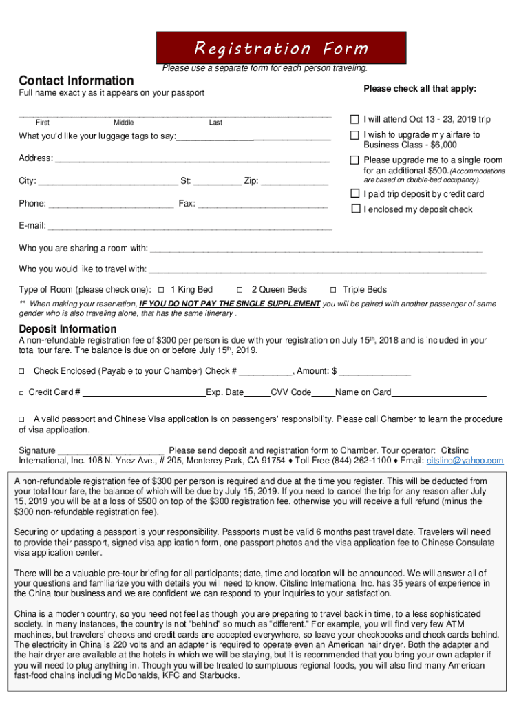 Please use a separate form for each person traveling. Contact InformationPlease check all that apply:Full name exactly as it appears on your passport
