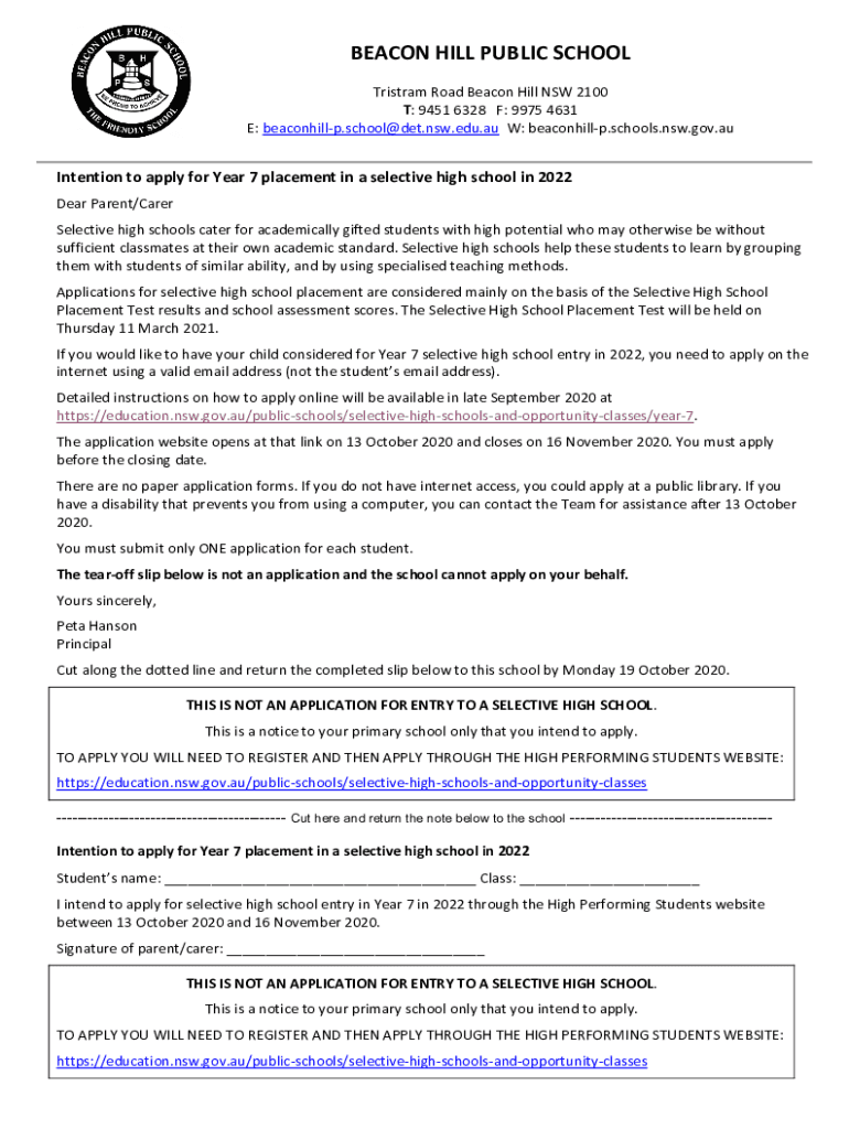 BEACON HILL PUBLIC SCHOOL Tristan Road Beacon Hill NSW 2100 T: 9451 6328 F: 9975 4631 E: beaconhillp.school@det.nsw.edu.au W: beaconhillp.schools.NSW.gov.intention to apply for Year 7 placement in