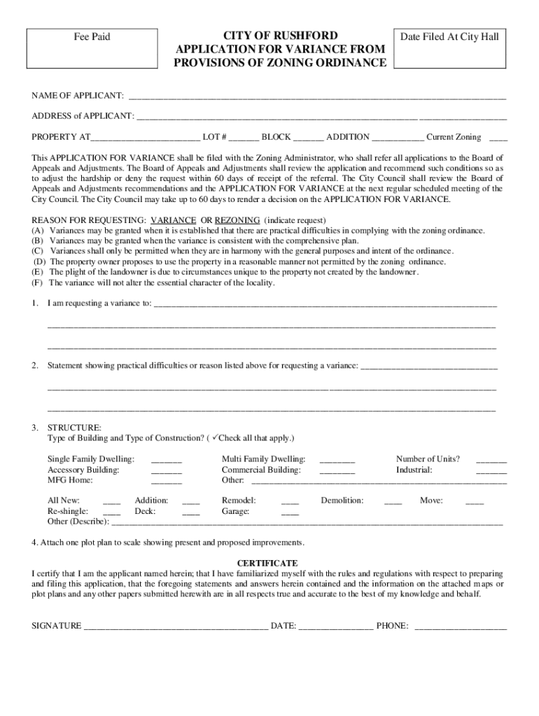 APPLICATION FOR VARIANCE FROM
