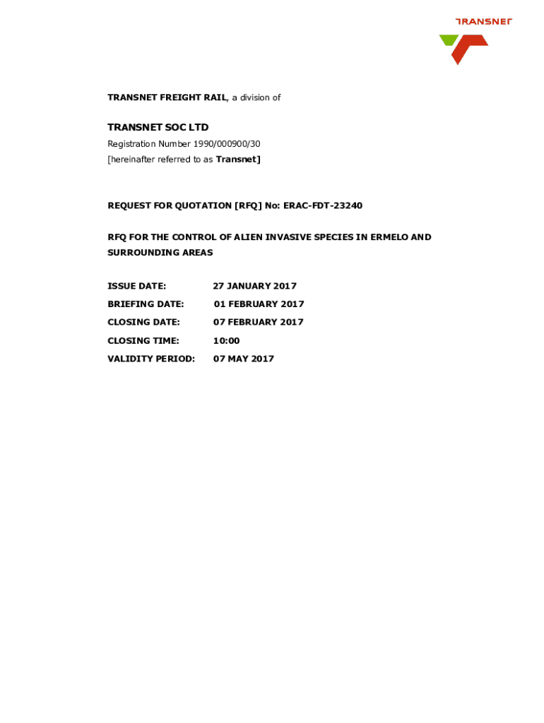 TRANSFER FREIGHT RAIL, a division ofTRANSNET SOC LTD Registration Number 1990/000900/30 [hereinafter referred to as Transnet]REQUEST FOR QUOTATION [RFQ] No: ERACFDT23240RFQ FOR THE CONTROL OF ALIEN
