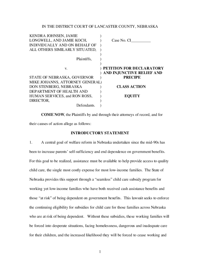 IN THE DISTRICT COURT OF LANCASTER COUNTY, NEBRASKA KENDRA JOHNSON, JAMIE LOWELL, AND JAMIE KOCH, INDIVIDUALLY AND ON BEHALF OF ALL OTHERS SIMILARLY SITUATED,) ) Case No. CI___))) Plaintiffs, ) )