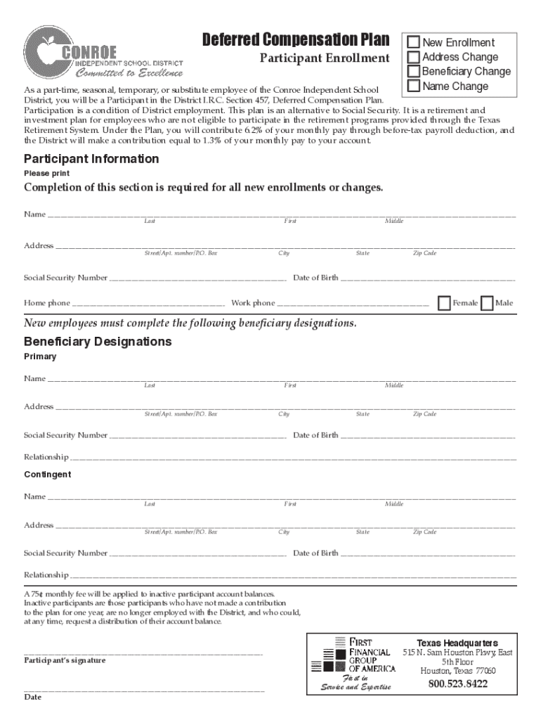 Deferred Compensation Plan Participant Enrollment New Enrollment Address Change Beneficiary Change Name Changes a part-time, seasonal, temporary, or substitute employee of the Conroe Independent School