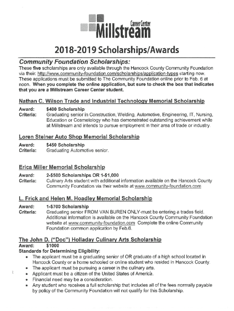 Millstrlclffl 20182019 Scholarships/ Awards Community Foundation Scholarships: These five scholarships are only available through the Hancock County Community Foundation via their: http://www.communityfoundation.com/scholarships/application