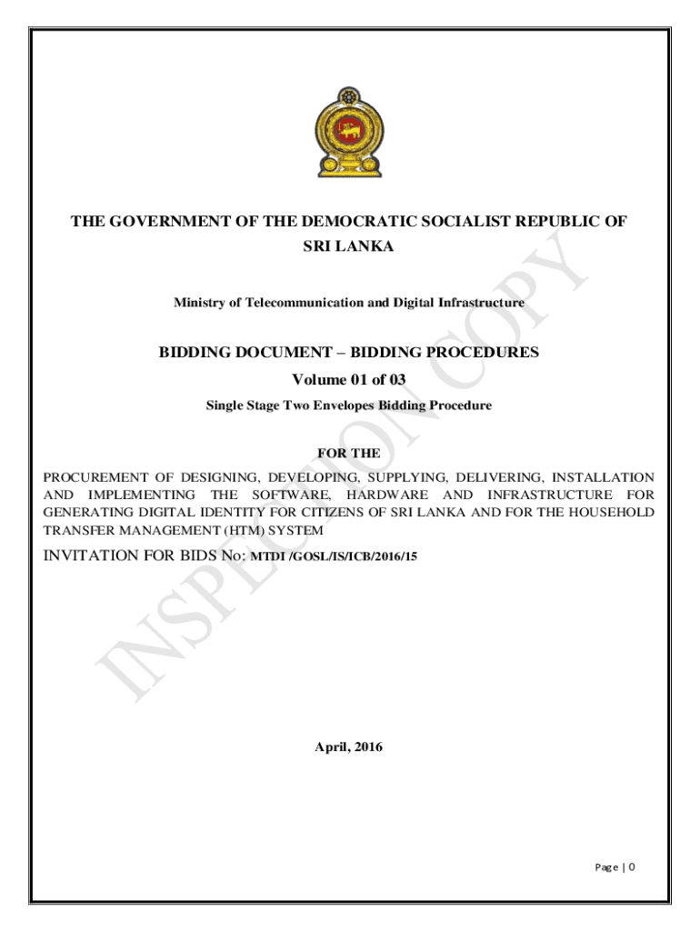 THE GOVERNMENT OF THE DEMOCRATIC SOCIALIST REPUBLIC OF SRI LANKAMinistry of Telecommunication and Digital InfrastructureBIDDING DOCUMENT BIDDING PROCEDURES Volume 01 of 03 Single Stage Two Envelopes