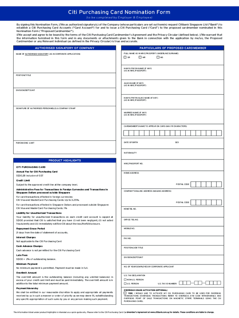 Get the free Citi Purchasing Card Nomination Form - Citibank Singapore
