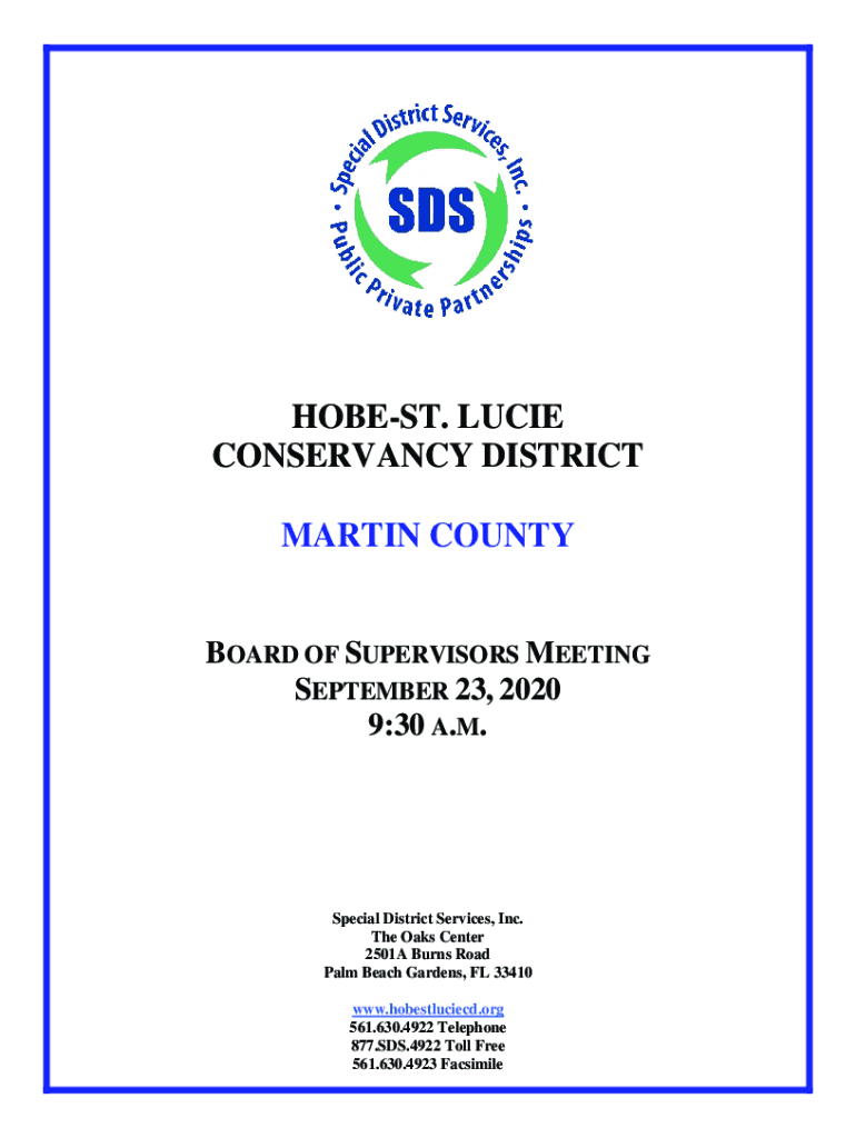 HONEST. LUCIE CONSERVANCY DISTRICT MARTIN COURTYARD OF SUPERVISORS MEETING SEPTEMBER 23, 2020 9:30 A.M. Special District Services, Inc. The Oaks Center 2501A Burns Road Palm Beach Gardens, FL 33410