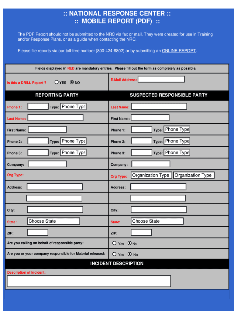 NATIONAL RESPONSE CENTER :: :: MOBILE REPORT (PDF) :: The PDF Report should not be submitted to the NRC via fax or mail. They were created for use in Training and/or Response Plans, or as a guide