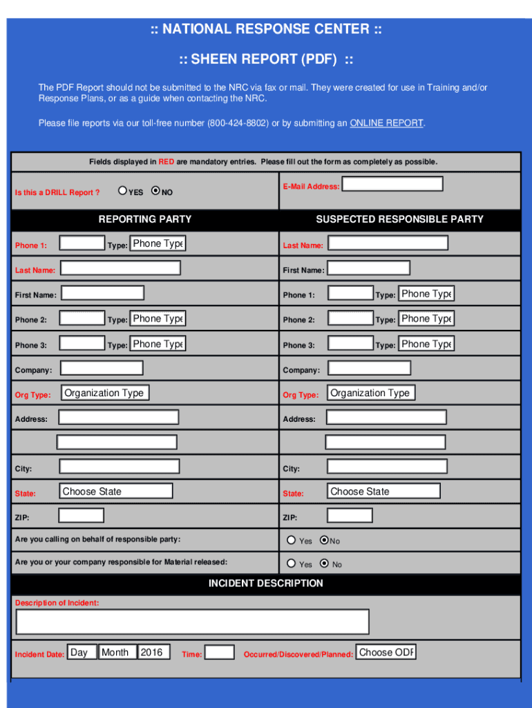 NATIONAL RESPONSE CENTER :: :: SHEEN REPORT (PDF) :: The PDF Report should not be submitted to the NRC via fax or mail. They were created for use in Training and/or Response Plans, or as a guide when