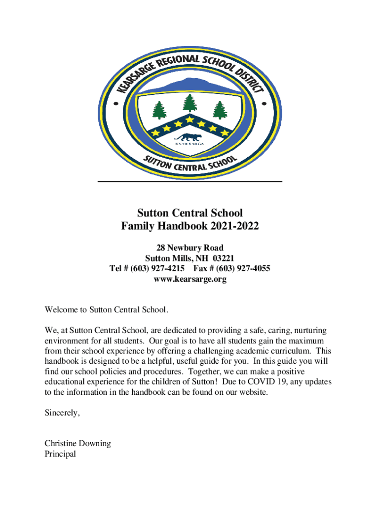 Sutton Central School Family Handbook 20212022 28 Newbury Road Sutton Mills, NH 03221 Tel # (603) 9274215 Fax # (603) 9274055 www.kearsarge.orgWelcome to Sutton Central School. We, at Sutton Central