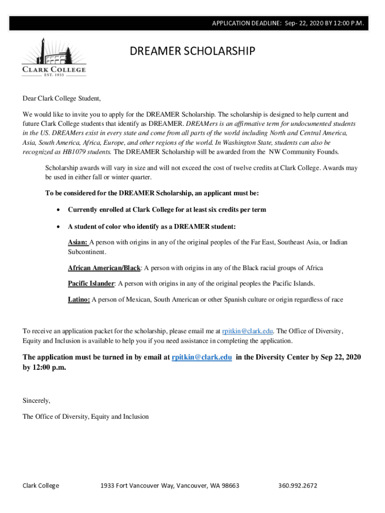 APPLICATION DEADLINE: Sep 22, 2020 BY 12:00 P.M. APPLICATION DEADLINE: MARCH 6, 2009, BY 4:30 P.M.DREAMER SCHOLARSHIPDear Clark College Student, We would like to invite you to apply for the DREAMER