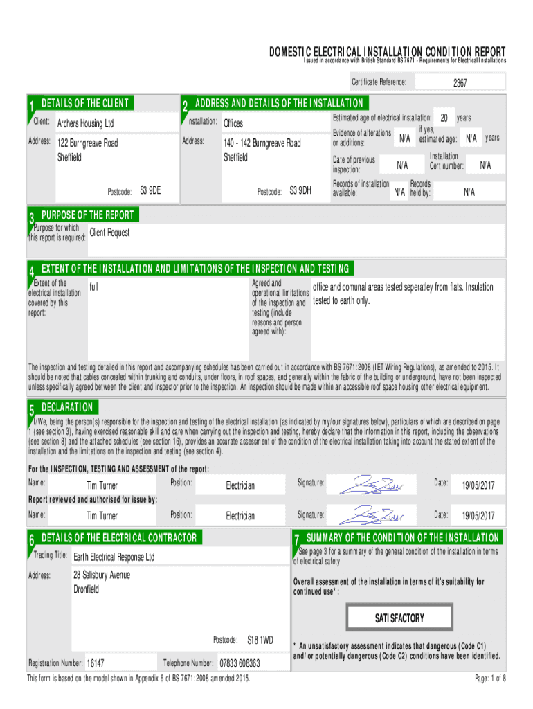 DOMESTIC ELECTRICAL INSTALLATION CONDITION REPORT Issued in accordance with British Standard BS 7671 Requirements for Electrical Installations 2367Certificate Reference:1DETAILS OF THE CLIENT\' Client: