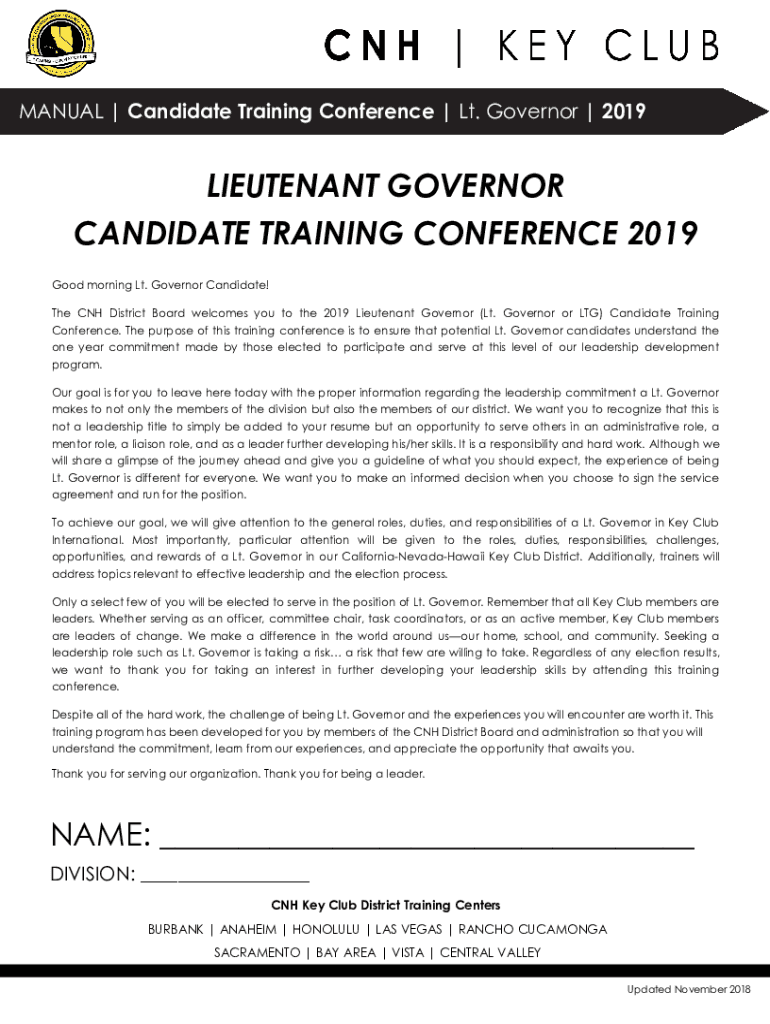 MANUAL | Candidate Training Conference | Lt. Governor | 2019LIEUTENANT GOVERNOR CANDIDATE TRAINING CONFERENCE 2019 Good morning Lt. Governor Candidate! The CNH District Board welcomes you to the 2019