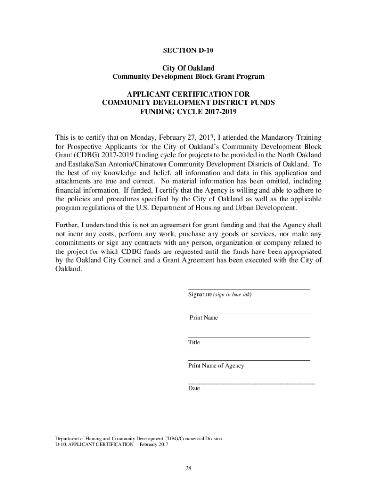 SECTION D10 City Of Oakland Community Development Block Grant Program APPLICANT CERTIFICATION FOR COMMUNITY DEVELOPMENT DISTRICT FUNDS FUNDING CYCLE 20172019This is to certify that on Monday, February
