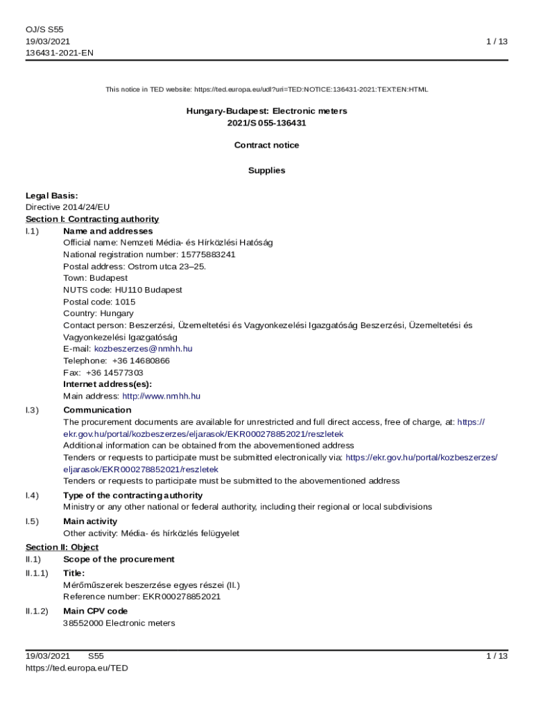 OJ/S S55 19/03/2021 1364312021EN1 / 13This notice in TED website: https://ted.europa.eu/udl?uriTED:NOTICE:1364312021:TEXT:EN:HTMLHungaryBudapest: Electronic meters 2021/S 055136431 Contract notice