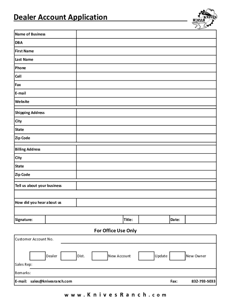 Dealer Account Application Name of Business DBA First Name Last Name Phone Cell Fax Email Website Shipping Address City State Zip Code Billing Address City State Zip Code Tell us about your business