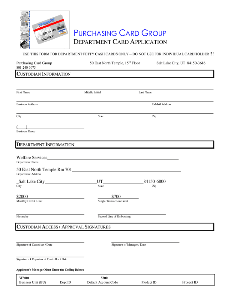 PURCHASING CARD GROUP DEPARTMENT CARD APPLICATION USE THIS FORM FOR DEPARTMENT PETTY CASH CARDS ONLY DO NOT USE FOR INDIVIDUAL CARDHOLDER!!!50 East North Temple, 15th FloorPurchasing Card Group Salt