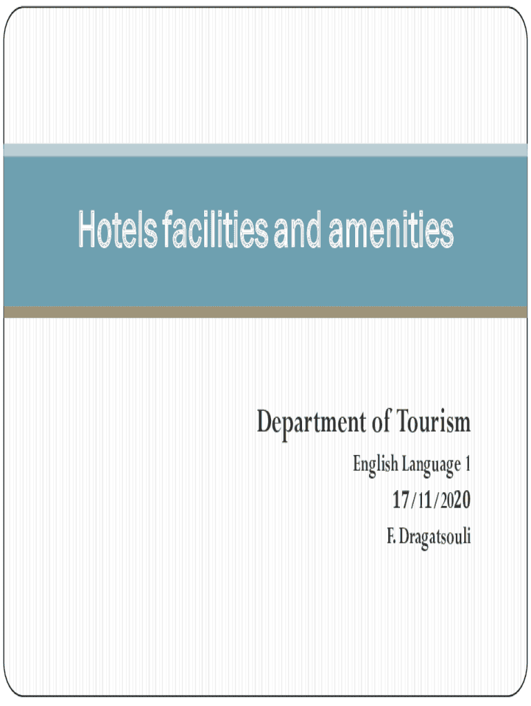 Hotels facilities and amenitiesDepartment of Tourism English Language 1 17/11/2020 F. DragatsouliHotel facilities Most hotels offer their guests many facilities and amenities for their use and enjoyment.