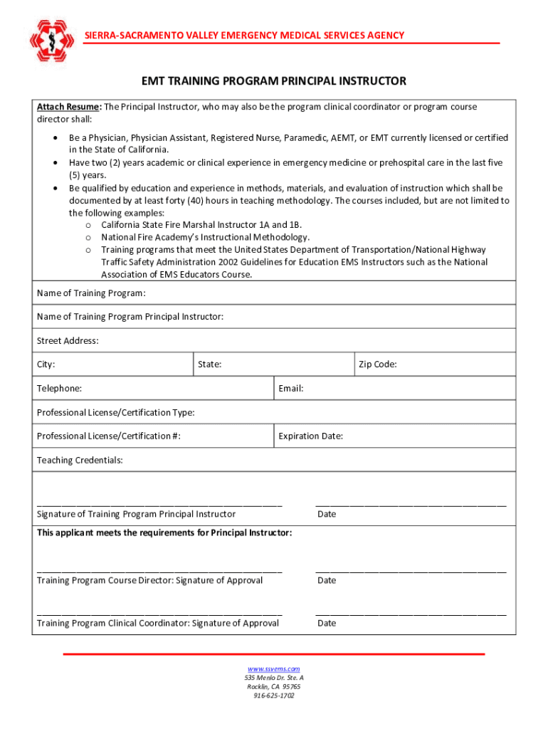 SIERRASACRAMENTO VALLEY EMERGENCY MEDICAL SERVICES AGENCY EMT TRAINING PROGRAM PRINCIPAL INSTRUCTOR Attach Resume: The Principal Instructor, who may also be the program clinical coordinator or program
