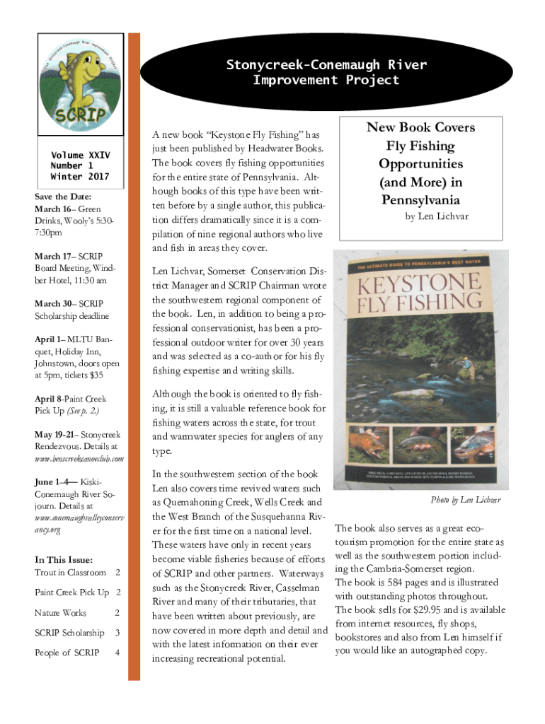 StonycreekConemaugh River Improvement ProjectVolume XXIV Number 1 Winter 2017Save the Date: March 16 Green Drinks, Wooly 5:307:30pm March 17 SCRIP Board Meeting, Winder Hotel, 11:30 am March 30 SCRIP
