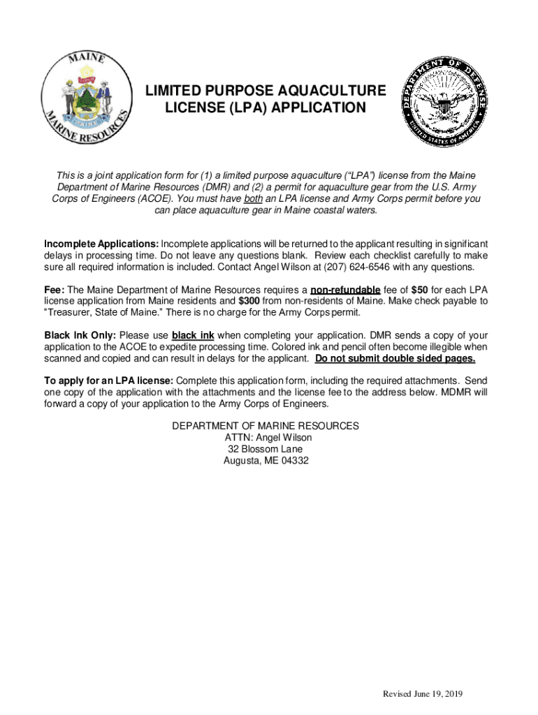 LIMITED PURPOSE AQUACULTURE LICENSE (PA) Applications is a joint application form for (1) a limited purpose aquaculture (PA) license from the Maine Department of Marine Resources (DMR) and (2) a permit