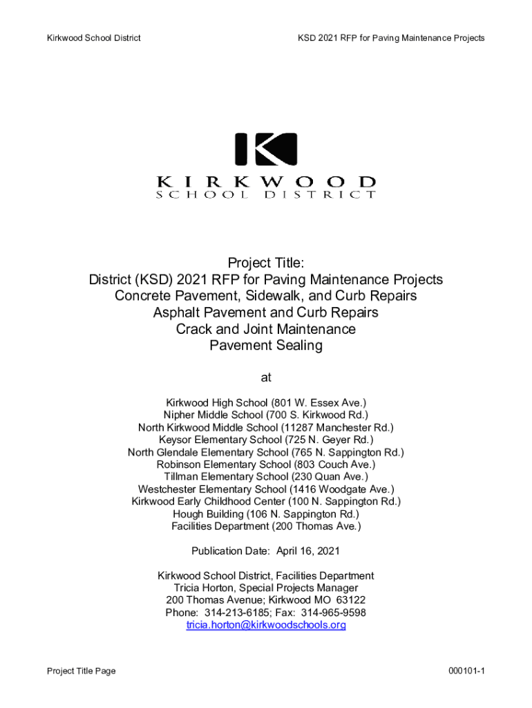 Kirkwood School Districts 2021 RFP for Paving Maintenance ProjectsProject Title: District (SD) 2021 RFP for Paving Maintenance Projects Concrete Pavement, Sidewalk, and Curb Repairs Asphalt Pavement