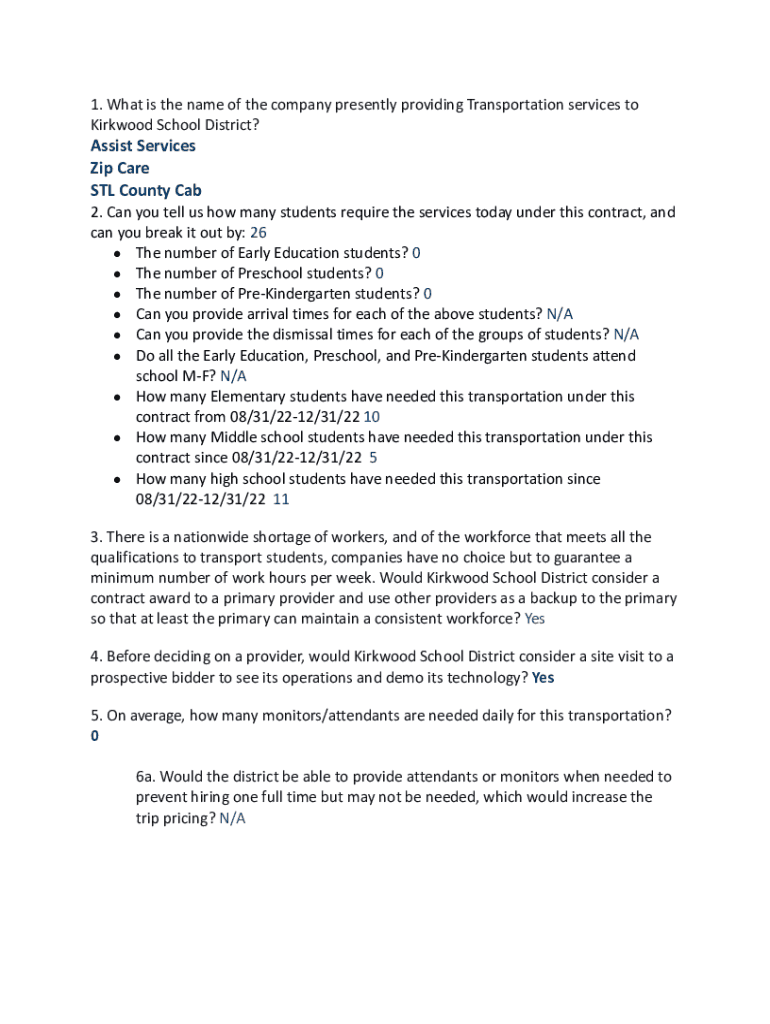 1. What is the name of the company presently providing Transportation services to Kirkwood School District? Assist Services Zip Care STL County Cab 2. Can you tell us how many students require the