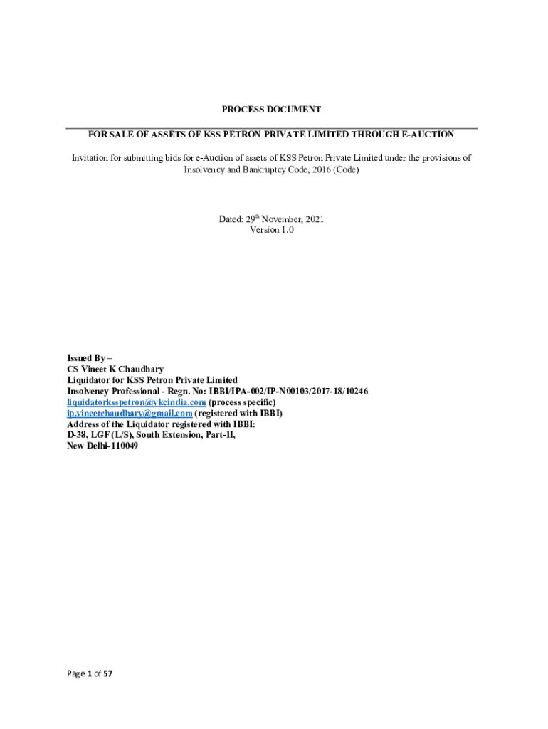 Invitation for submitting bids for auction of assets of KSS Patron Private Limited under the provisions of