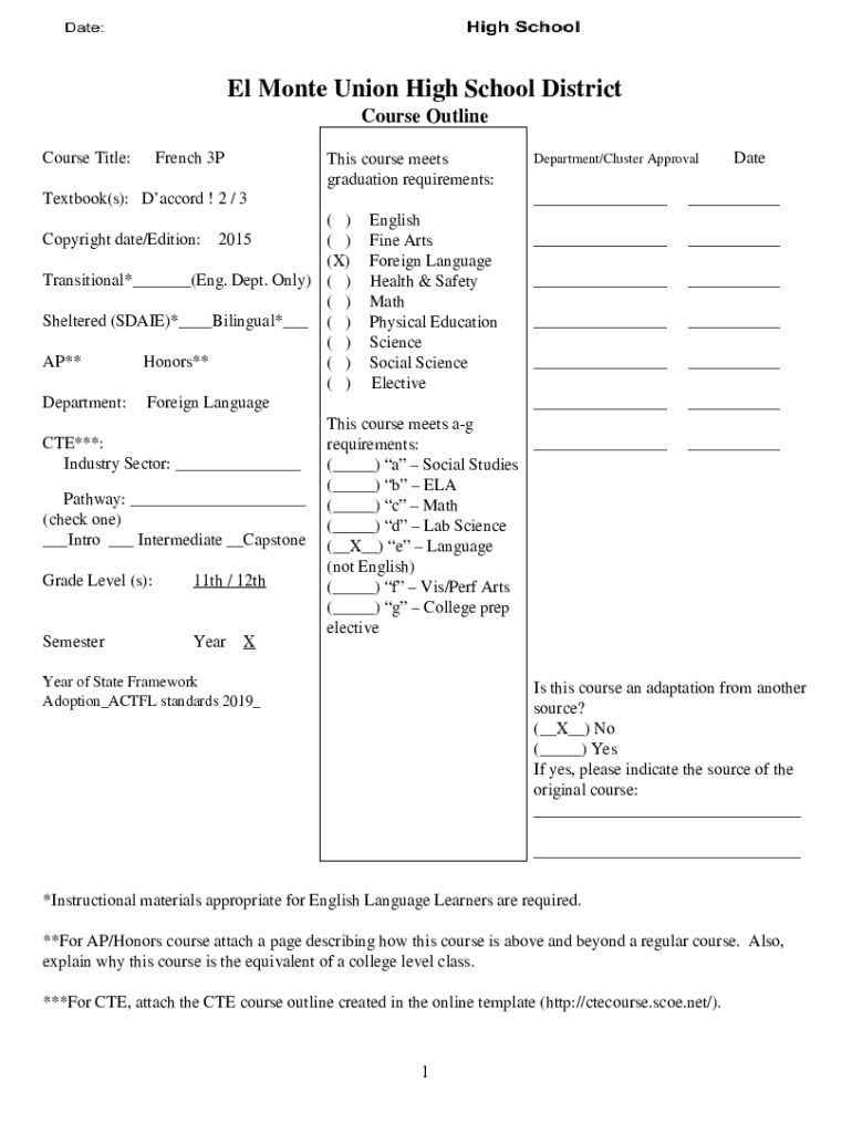 El Monte Union High School District Course Outline Course Title: French 3P Textbook(s): Accord ! 2 / 3 Copyright date/Edition: 2015 Transitional*___(Eng. Dept. Only) Sheltered (SD AIE)*___Bilingual*___